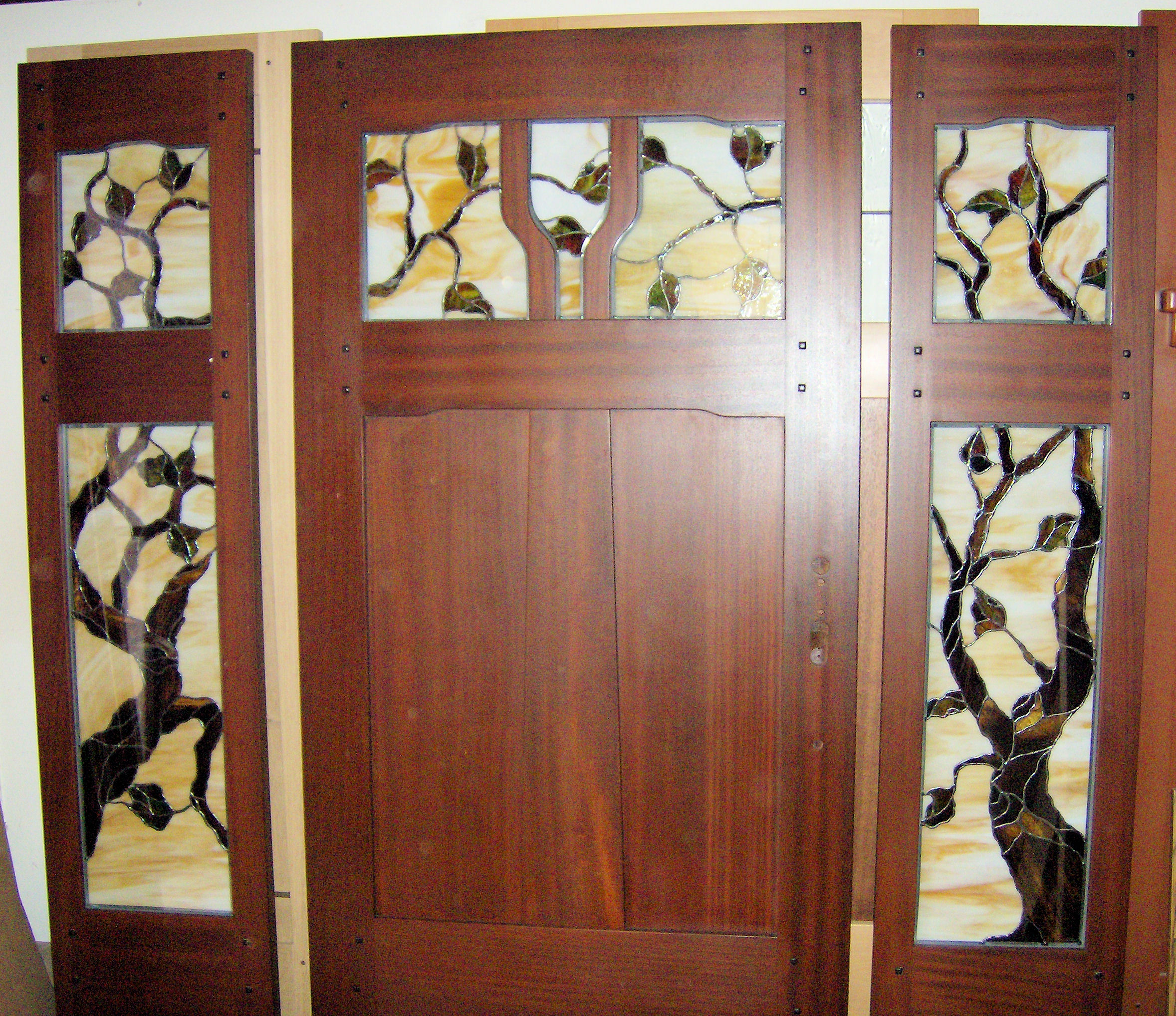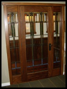 Right : Mahogany single lite door & sidelites with FLW inspired leaded glass